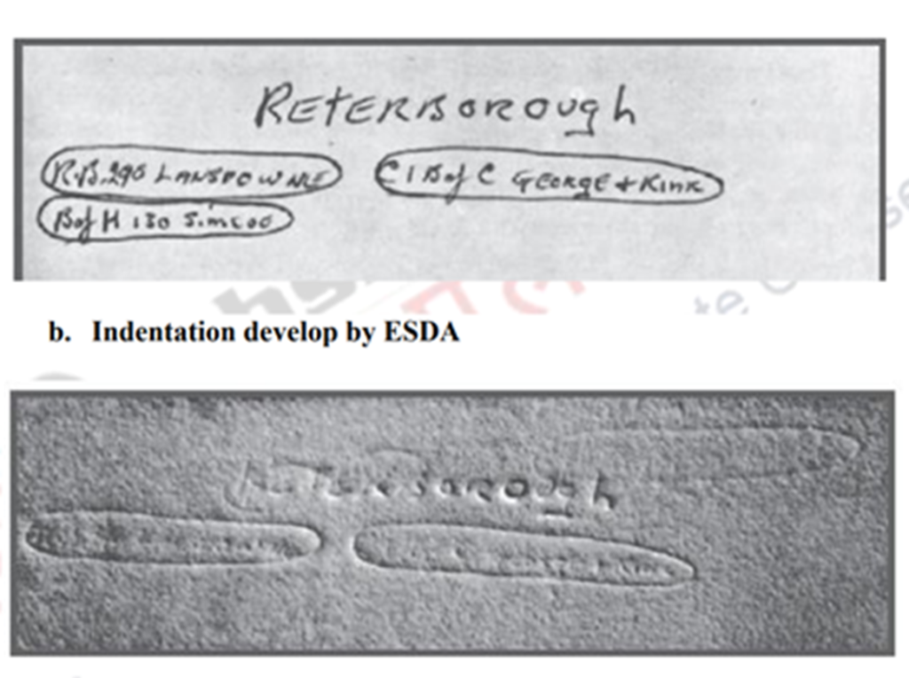 - Deep or heavy indented writing on a page should not be taken for examination because ESDA fails to decipher deep indentations, so that time we can take 3rd or 4th sheet of document for examination as it will have normal indentations and can be deciphered by ESDA.