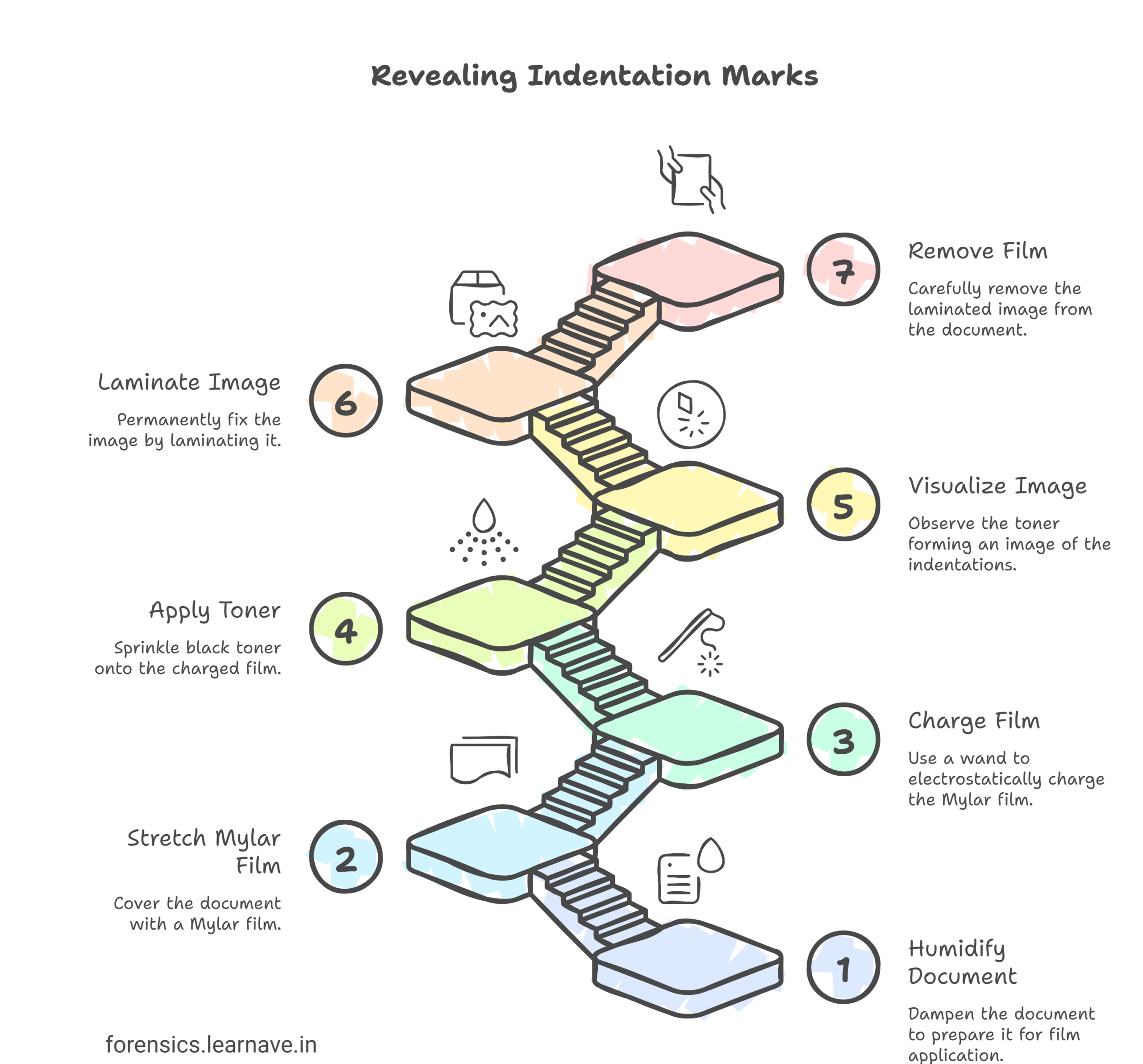 - This causes the toner (negatively charged particles) used in the Electrostatic Detection Device (EDD) to be attracted to these areas, revealing indentations.